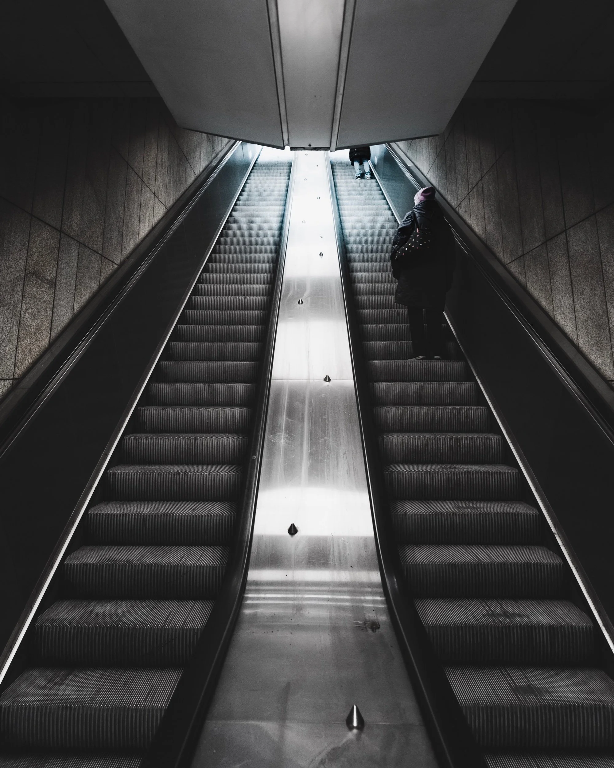 Frau mit Blumen fährt die Rolltreppen zum Bahnsteig hinab.